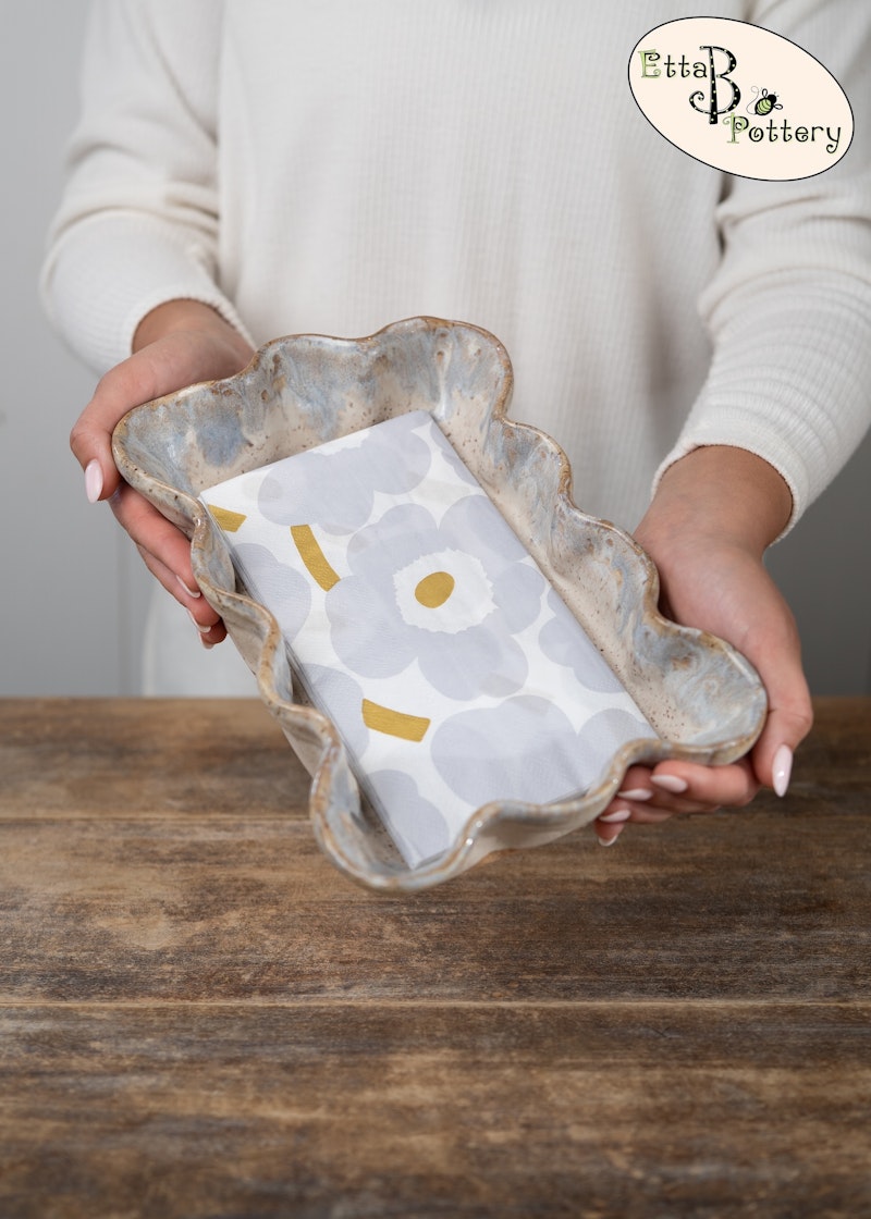 Guest sized napkin holder with hand crafted ruffled edge. No two are just alike.