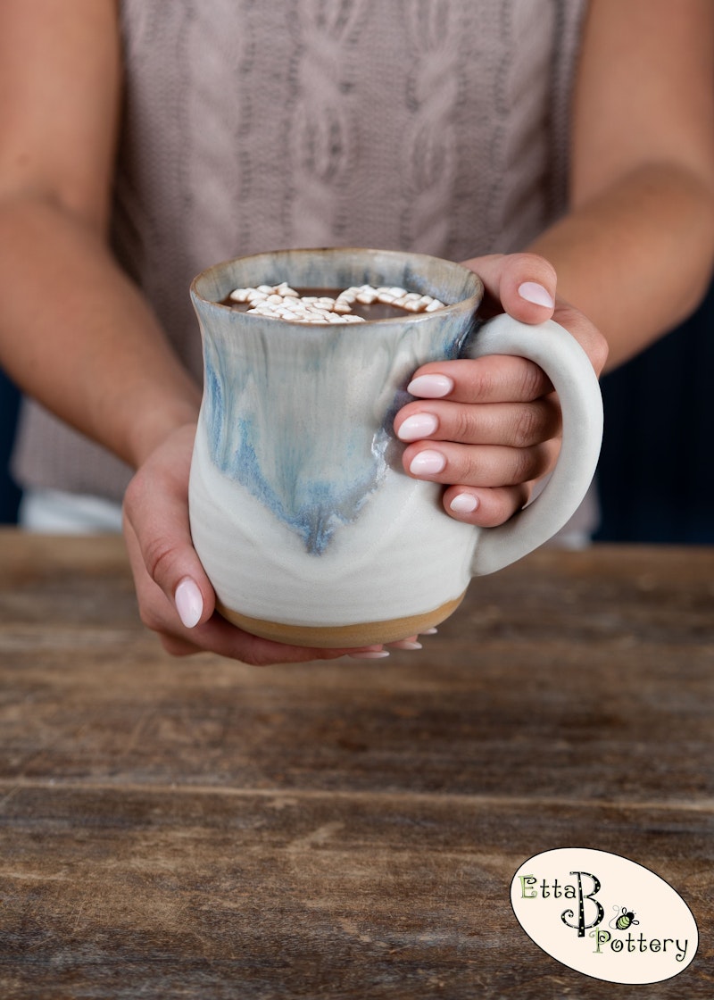 This impressive mug has a beautiful shape and is perfect for a cozy cup of cocoa, soup or a nice large coffee. Available in Oyster (greys) and Oasis (blues)
