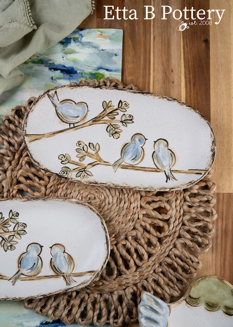 Etta B Pottery is handmade and hand-painted in Etta, Mississippi. Every step is done by hand, resulting in pottery that feels both intentional and personal. Each piece requires a minimum of 6 weeks from start to finish and is handled more than 30 times throughout our small shop from being handmade, hand-painted, skillfully fired in the kilns and gently packed for safe shipping. Designed to be used and enjoyed, every piece brings a balance of beauty with everyday function. Thank you for supporting handmade. We hope you find something to love and keep for years as you gather around the table or give a gift to a friend. You always have a true one-of-a-kind piece with Etta B.