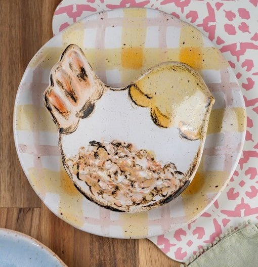 The Buttercup Yellow and Blushing Rose is pictured on our Buttercup Yellow Plaid Salad Plate.