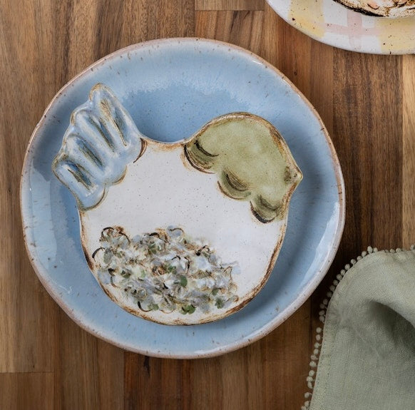 The Cornflower and Meadow Green is pictured on our Farmhouse Salad Plate in Wisteria.