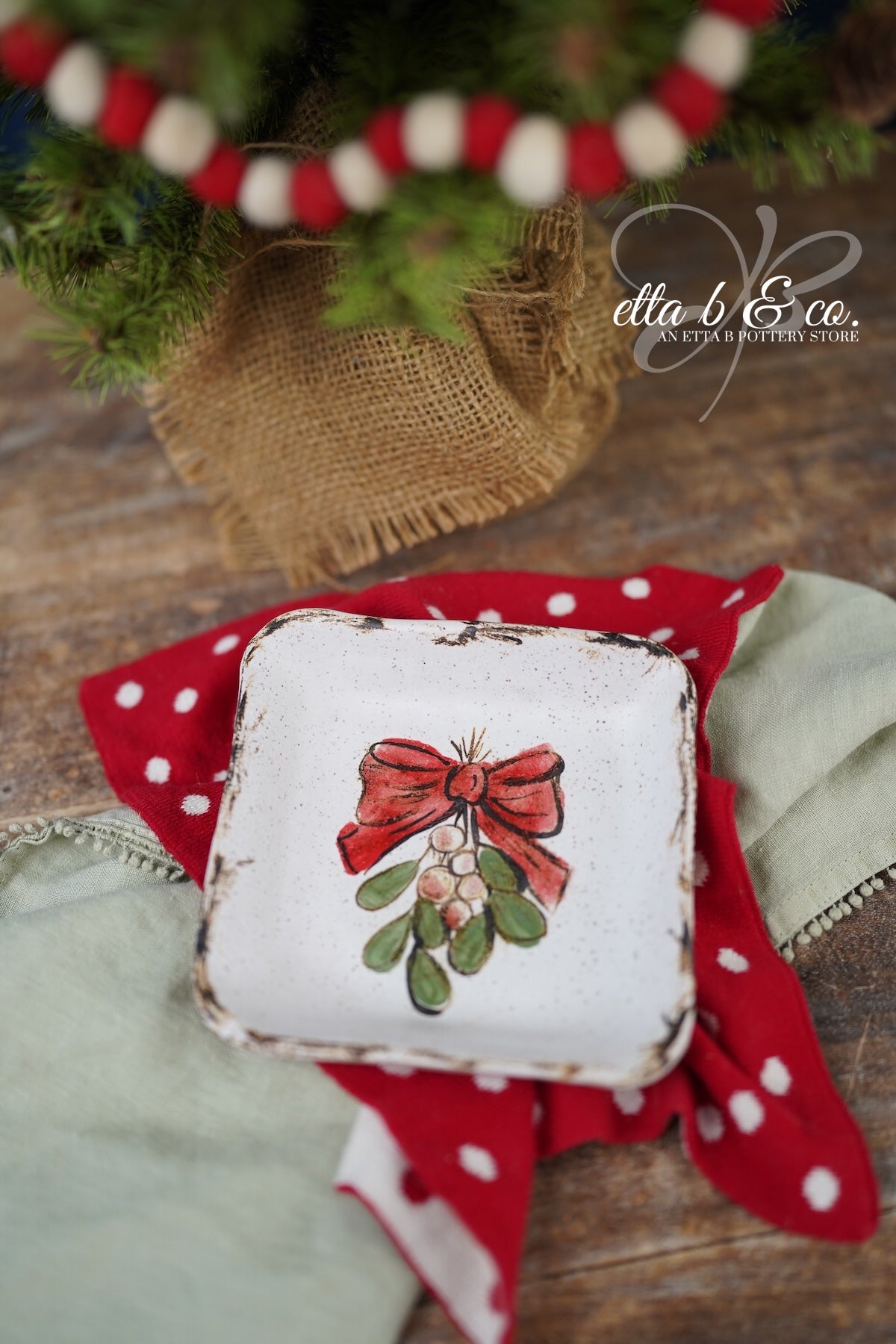 Such a darling square dish with a cheerful sprig of mistletoe tied up in a bow.