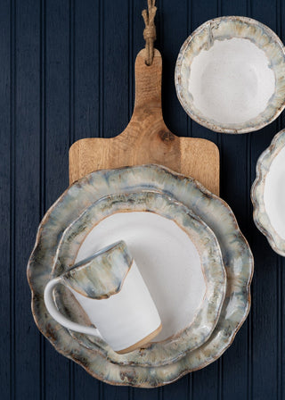 Glossy off-white glaze with a glossy wisteria striped edge.