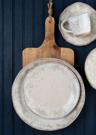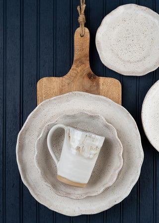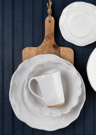 Matte, off-white glaze with a tone-on-tone glossy rim.