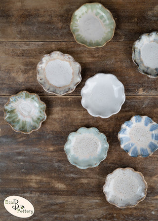 Matte, off-white center with a glossy blue rim.