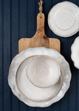 Glossy, off-white cream with a light blue rim.