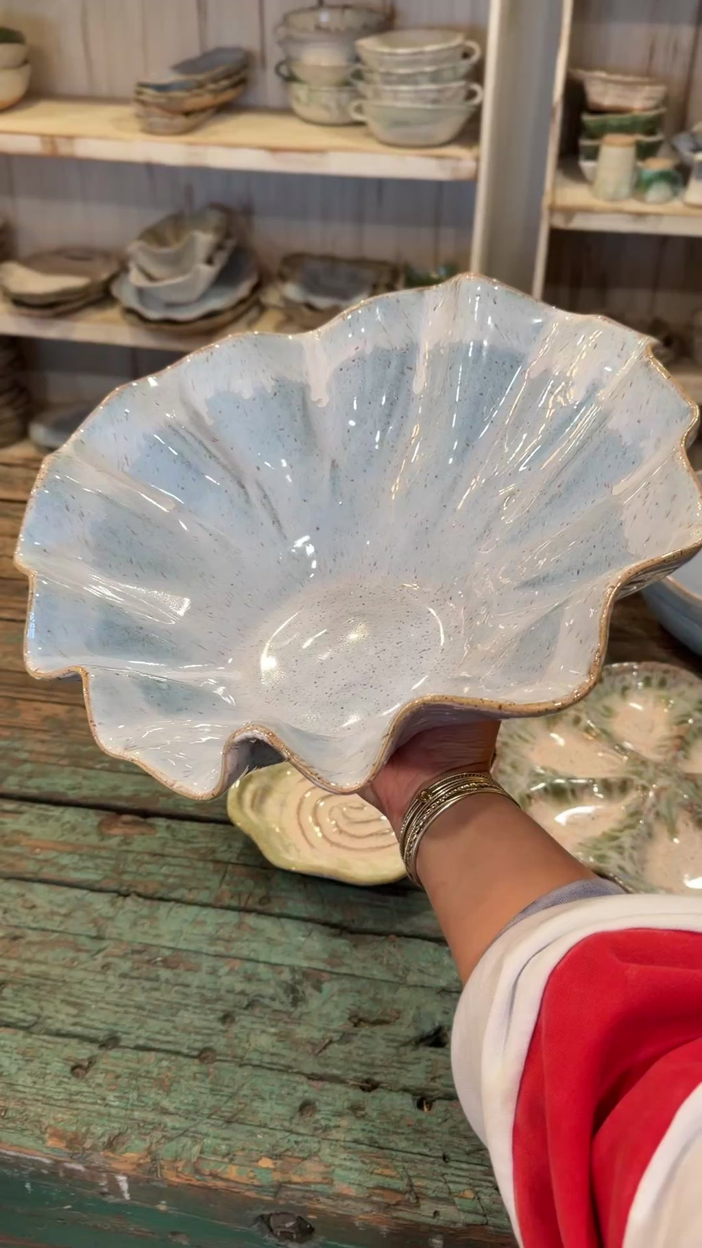 Introducing The Ruffled Gathering Bowl. This is an artfully asymmetrical piece that captures organic, handmade elegance. One side dips lower than the other, creating a distinctive silhouette. It is quite exceptional!