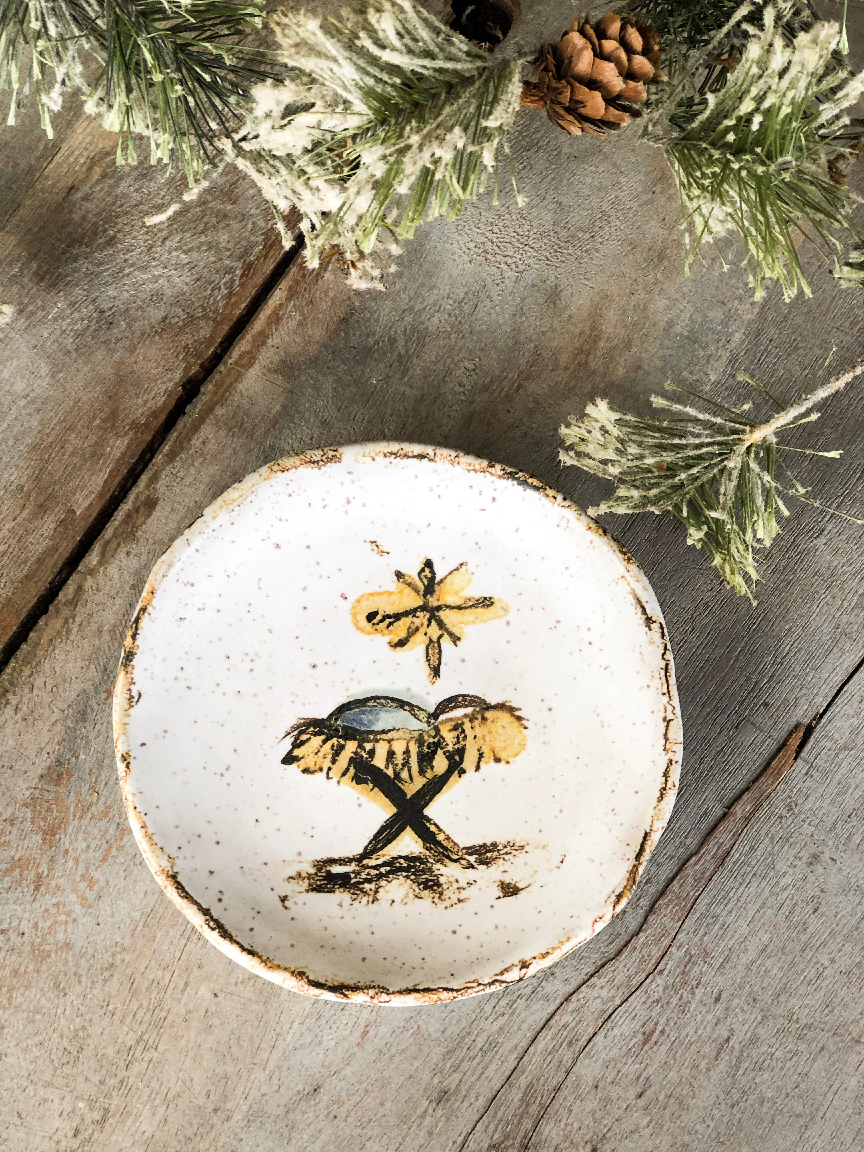 This darling manger plate measures between 5" and 5.5" as each one is handmade.